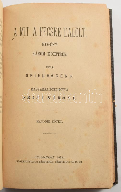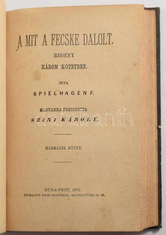 Spielhagen F.: A mit a fecske dalolt. Regény három kötetben. Magyarra fordította: Szini Károly. Bp., 1873, Kocsi Sándor. Félvászon kötés, kopottas állapotban.