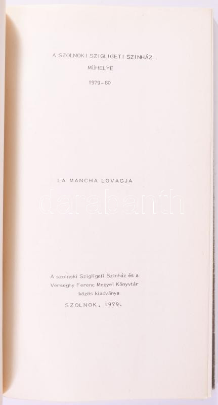 Wassermann - Mitch - Darion: La Mancha lovagja. Musical. Fordította: Blum Tamás. Szolnok, 1979, Szigligeti Színház és Verseghy Ferenc Megyei Könyvtár. Készült 400 példányban. Papírkötésben, jó állapotban.