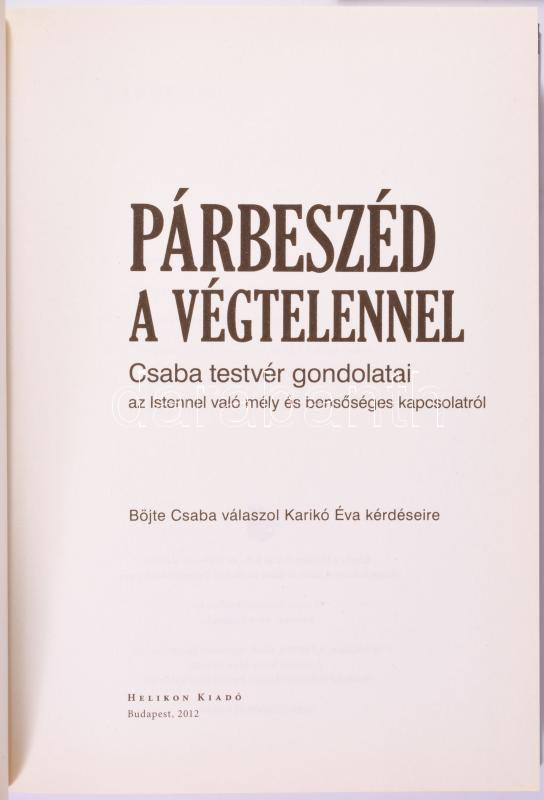 2 db - Párbeszéd a végtelennel. Csaba testvér gondolatai. Böjte Csaba válaszol Karikó Éva kérdéseire. Bp., 2012, Helikon. Iránytű a végtelenhez. Csaba testvér gondolatai. Böjte Csaba válaszol Karikó Éva kérdéseire.Bp., 2011, Helikon. Kiadói kartonált kötés, jó állapotban.