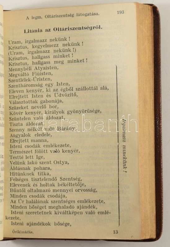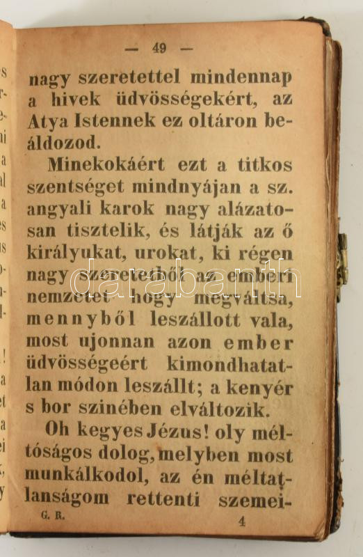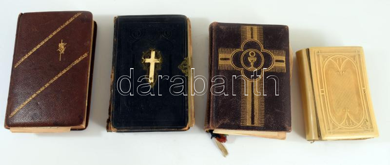 4 db imakönyv - Jó illatú kis rózsáskert, melyben sok szép imádságok és énekek találtatnak [...]. Pest, Bucsányszky. + Ájtatosság gyöngyei. Winterberg, Steinbrener. + Örökimádás. A legméltóságosabb Oltáriszentség imakönyve. Kiskunmajsa, 1910. + Misekönyv. Bp., Palladis. Kötetenként változó kötésben és állapotban.