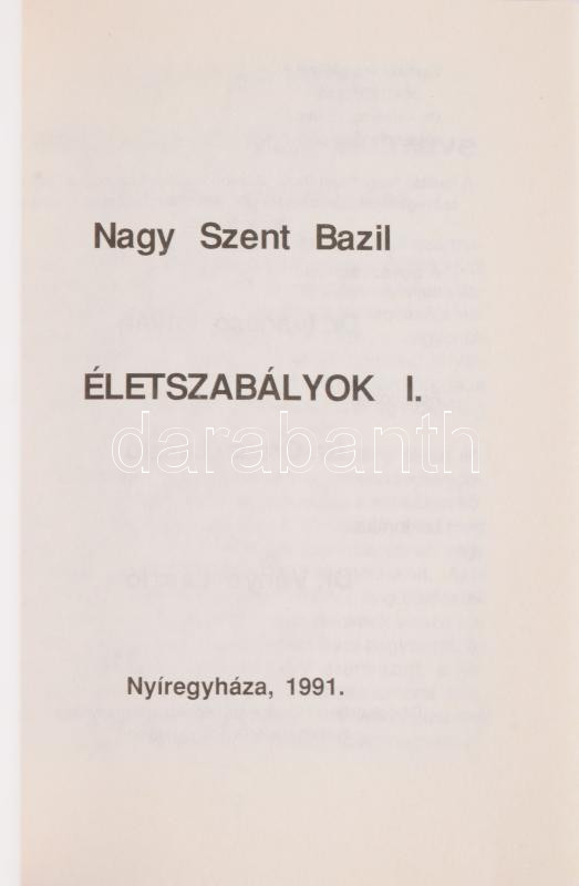Nagy Szent Bazil: Életszabályok I. Nyíregyháza, 1991. 168p. Kiadói papírkötés, jó állapotban.