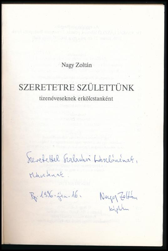 Nagy Zoltán: Szeretetre születtünk. Tizenéveseknek erkölcstanként. DEDIKÁLT! 1995, JEL Kiadó. Kiadói papírkötés, kissé kopottas állapotban.