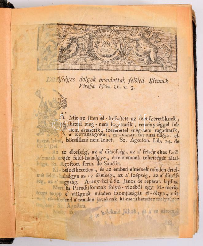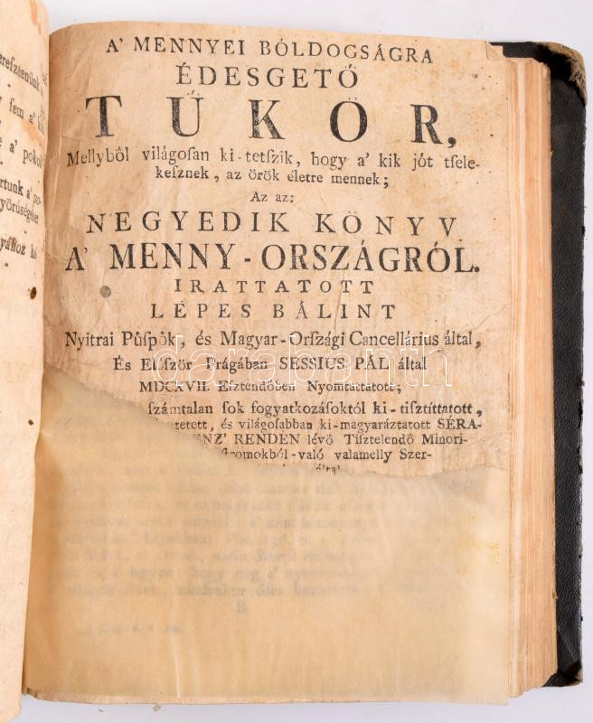 XVIII. sz. utolsó harmada Lépes Bálint: A pokoltól rettentő tűkör, mellyből világosan ki-tetszik: hogy a kik gonoszt tselekesznek, az örökké-való tűzre vettetnek. Az az: harmadik könyv a pokolról. Hozzákötve: A mennyei bóldogságra édesgető tűkör, mellyből világosan ki-tetszik, hogy a kik jót tselekesznek, az örök életre mennek; az az: negyedik könyv a menny-országról. hn.,én., nyn.,3-6 [Negyedik könyv szerepel a 6. oldal tetején, feltehetőleg a második bekötött műhöz tartozna]+17-383+7;+2+7-296 p.