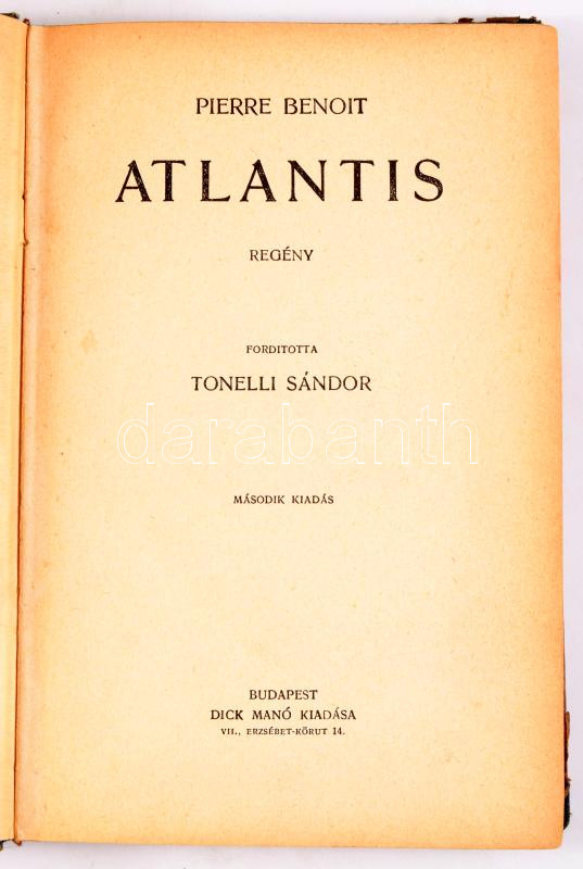 Benoit, Pierre: Atlantis. Regény. Ford.: Tonelli Sándor. Bp.,[1925.], Dick Manó, 227+5 p. Átkötött félvászon-kötés, kissé kopott borítóval, sérült gerinccel.