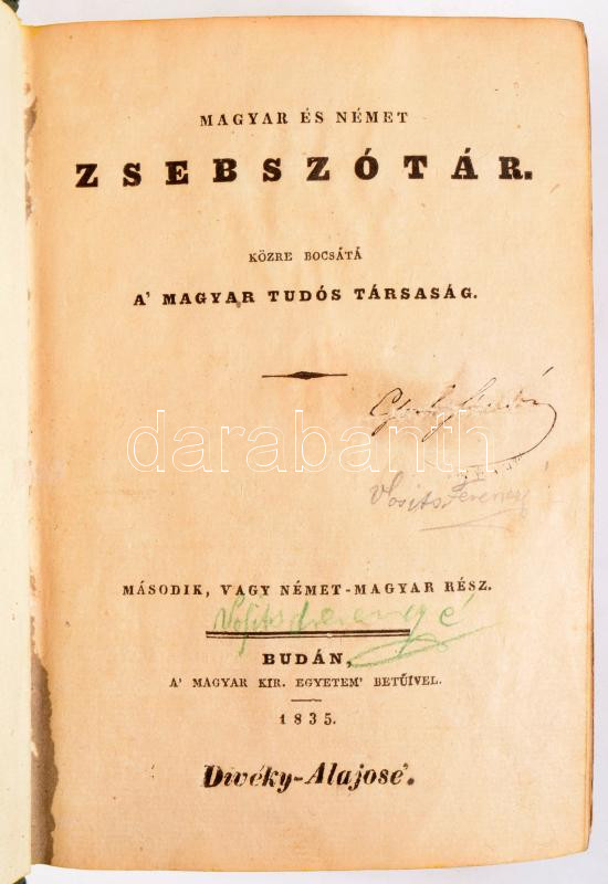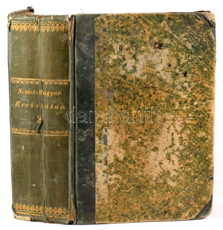 [Az első akadémiai német magyar szótár] Magyar és német zsebszótár 2. rész (Teljes). Közre bocsátá a' Magyar Tudós Társaság. Antal Mihály ügyelése alatt. Szerk.: Vörösmarty Mihály, és Schedel [Toldy]Ferenc. Az előszó Vörösmarty Mihály, és Schedel [Toldy] Ferenc Budán, 1835, Magyar Kir. Egyetem-ny., 2+ IV+2+846+2 p. Korabeli félvászon-kötésben, kopott borítóval, sérült gerinccel és kötéssel, kijáró lapokkal, az elülső szennylapon és a borítón bejegyzésekkel.
