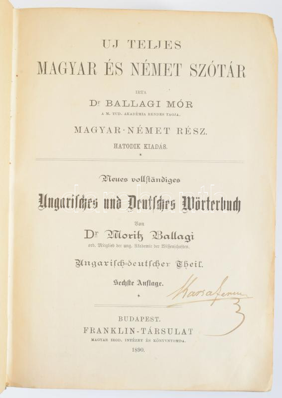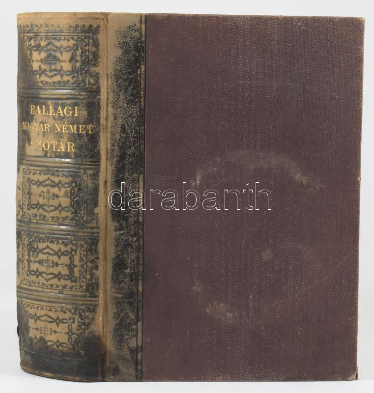 Ballagi Mór: Uj teljes magyar és német szótár. Magyar-német rész. Bp., 1890, Franklin-Társulat, IX+[3]+1089+[3] p. FélbÅ‘r-kötésben, kopott gerinccel, a borÃtón és a lapok egy részén ázásnyomokkal.
