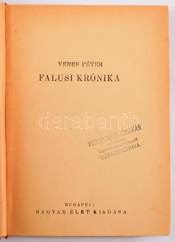 Veres Péter 3 db első kiadású kötete: Szocializmus, nacionalizmus. Bp., 1939, MEFHOSZ, 250+[2] p. Kiadói félvászon-kötés. + Falusi krónika. Bp., [1941], Magyar Élet, 266 p. Kiadói félvászon-kötés, ajándékozási bejegyzéssel. Koszorús Oszkár (1942-2025) okleveles könyvtáros, Orosháza város helytörténésze tulajdonosi bélyegzőivel. + Parasztsors - magyar sors. [Bp., 1941], Magyar Élet, 87+[7] p. Kiadói papírkötés, sérült, a lapok egy része kijár.
