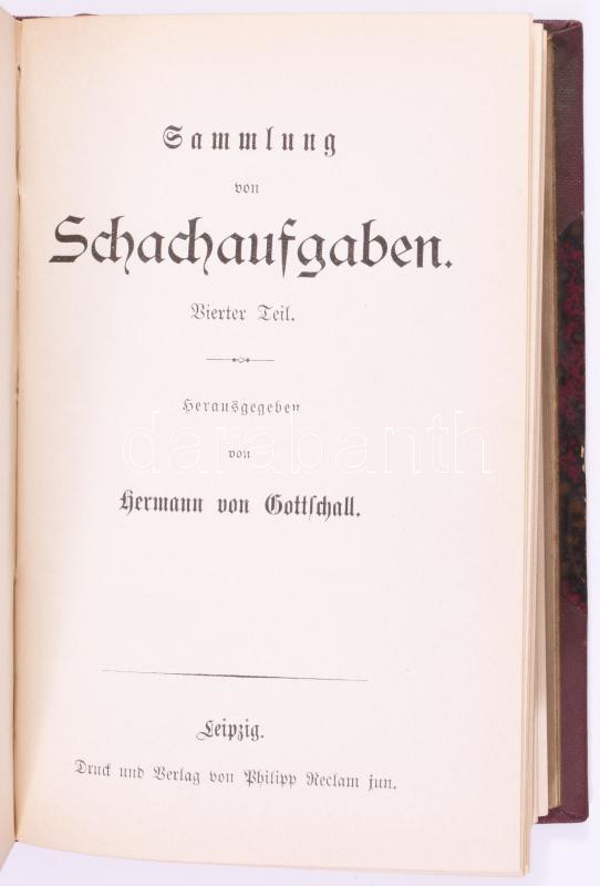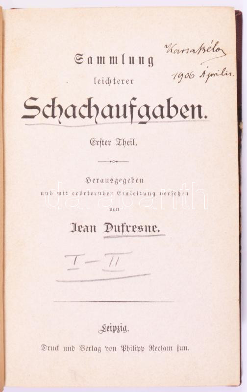 Jean Dufresne: Sammlung leichterer Schachaufgaben I-IV. Hrsg. und mit erörternder Einleitung versehen von - -. Leipzig,én.,Philipp Recalm, 213+3;+262 p.; 229+3;+222+1 p. Német nyelven. 1906-os névbejegyzéssel. Átkötött egészvászon-kötés, kissé kopott borítókkal.
