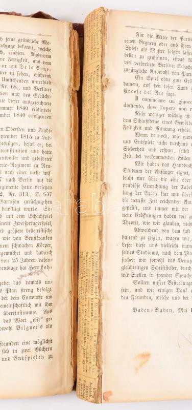 Paul Rudolf von Bilguer - Tassilo von Heydebrand und der Lasa: Handbuch des Schachspiels. Entworfen und angefangen von - -. Fortgesetz und Herausgegeben von [Tassilo von Heydebrand] u[nd] d[er] Lasa. Berlin, 1852, Verlag von Veit und Co., XII+494 p.+9 (Megjegyzésekkel írt jegyzetlapok, de ezen teleírt jegyzetlapok után számos üres jegyzetlap következik) sztl. lev. Zweite, durchans verbesserte Auflage. Átkötött félvászon-kötés, kopott borítóval, a könyvtest elvált a borítótól, sérült és szétvált kötéssel. Ritka kötet, de restaurálásra szorul.