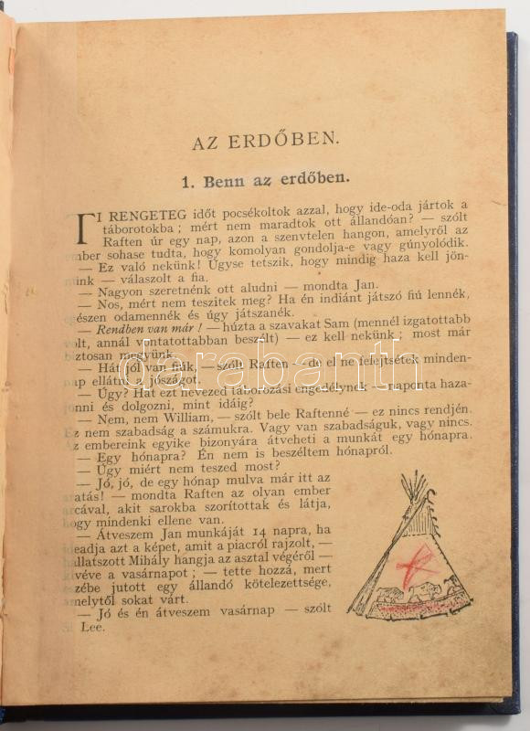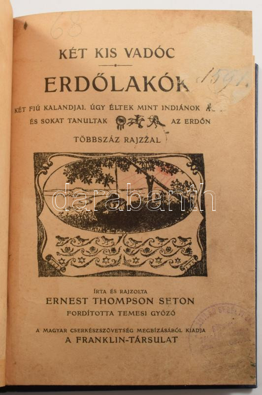 Ernest Thompson Seton: Két kis vadóc. Két fiú kalandjai. Úgy éltek, mint indiánok és sokat tanultak az erdőn. Írta és rajzolta: - - . Ford.: Temesi Győző. A Magyar Cserkésszövetség megbízásából kiadja a Franklin Társulat. Bp.,[1931.], Franklin, 126+1 p.+12 t. Szövegközti és egészoldalas illusztrációkkal. Újrakötött félvászon kötés, viseltes állapotban.