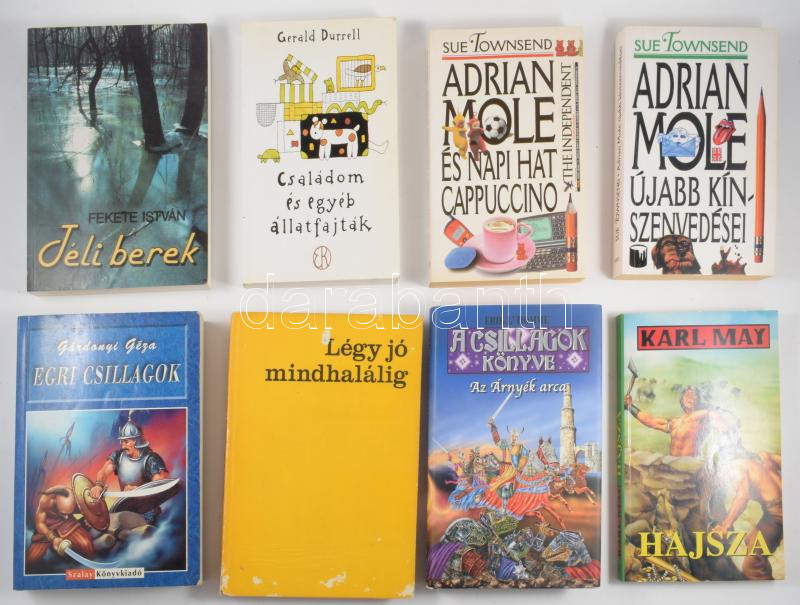 Vegyes ifjúsági regény tétel, 8 kötet: Gárdonyi Géza: Egri csillagok.; Móricz Zsigmond: Légy jó mindhalálig.; Fekete István: Téli berek.; Karl May: Hajsza.; Gerald Durrell: Családom és egyéb állatfajták.; Sue Townsend: Adrian Mole és napi hat cappuccino.; Adrian Mole újabb kínszenvedései.; Erik L'Homme: A Csillagok Könyve III. Az Árnyék arca. Vegyes állapotban.