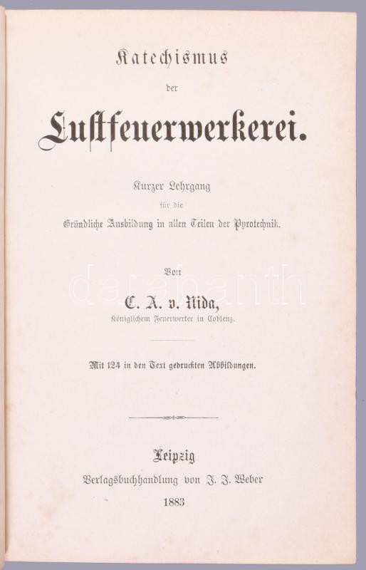 Nida, C. A.: Katechismus der Lustfeuerwerkerei. Kurzer Lehrgang für die gründliche Ausbildung an allen Teilen der Pyrotechnik. Webers Illustrirte Katechismen No. 111. Leipzig, 1883., J. J. Weber, VIII+214+8 p. Német nyelven. Szövegközti illusztrációkkal. Kiadói egészvászon-kötés, ceruzás bejegyzésekkel és bejelölésekkel.