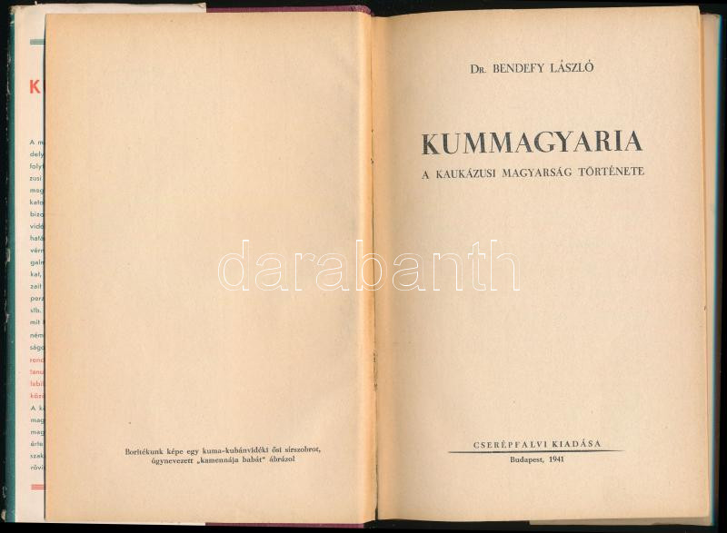 Bendefy László: Kummagyaria. A kaukázusi magyarság története. Bp., 1941, Cserépfalvi, 124+[4] p.+ 2 t. Első kiadás. Kiadói egészvászon-kötés, sérült kiadói papír védőborítóban, helyenként ceruzás bejegyzésekkel.