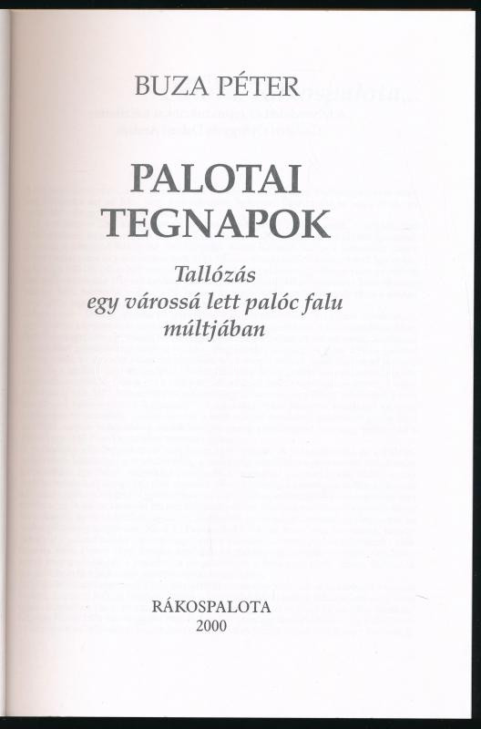 Buza Péter: Palotai tegnapok. Tallózás egy várossá lett palóc falu múltjában. Rákospalota, 2000, Rákospalotai Múzeum, 222+[2] p. Fekete-fehér képekkel illusztrálva. Kiadói papírkötés.