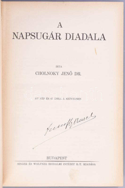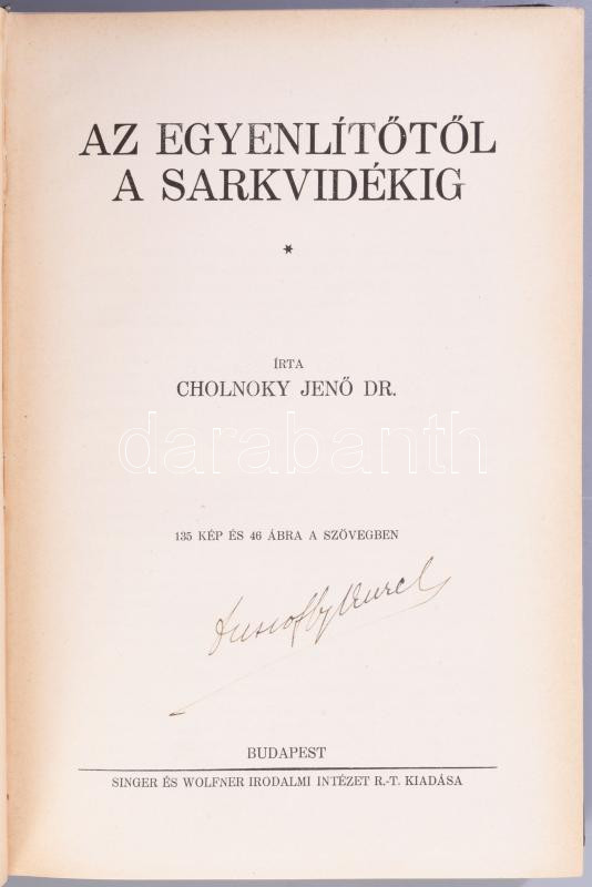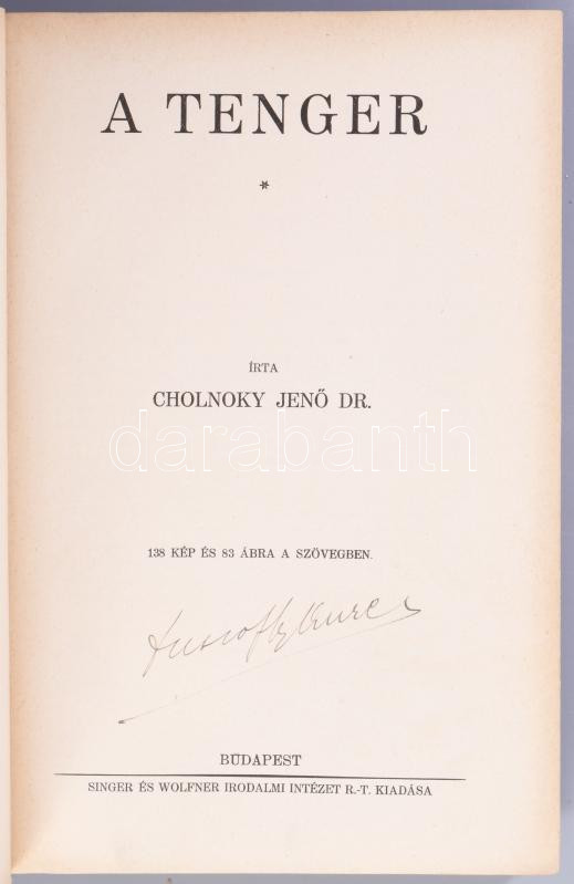 Cholnoky Jenő 3 darab műve a Singer és Wolfner kiadásában: Cholnoky Jenő: A tenger. Bp., 1931, Singer és Wolfner. Kiadói egészvászon kötés + Cholnoky Jenő: Az egyenlítőtől a sarkvidékig. Bp.,1930, Singer és Wolfner. Fekete-fehér fotókkal illusztrált. Kiadói aranyozott egészvászon kötés + + Cholnoky Jenő: A napsugár diadala. 107 kép és 67 ábra a szövegben. Bp., 1930, Singer és Wolfner. Kiadói aranyozott egészvászon kötés