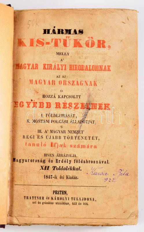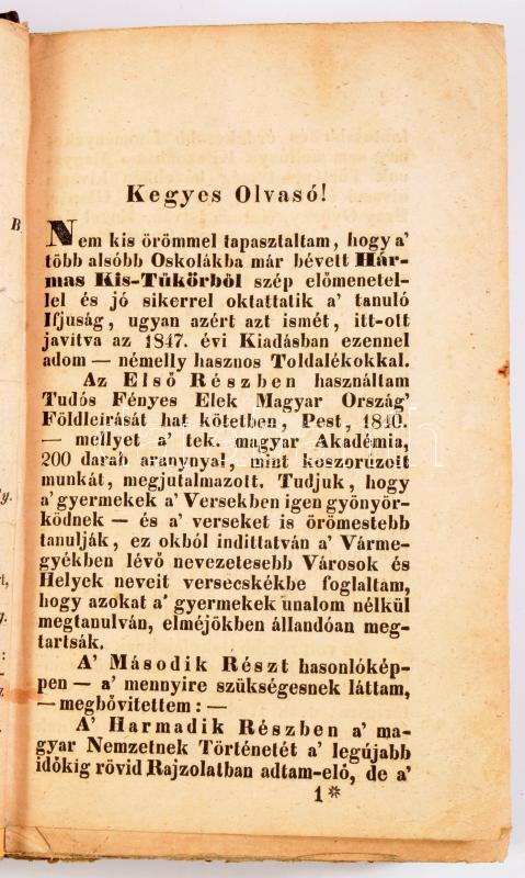 [Losontzi István]: Hármas kis-tűkör, melly A' Magyar Királyi Birodalomnak az az: Magyarországnak és hozzá kapcsoltt egy részeinek I. Földleirását, II. Mostani polgári állapotját, 's III. A' Magyar Nemzet' régi és újabb történetét, tanuló ifjak számára hiven ábrázolja. Magyarország és Erdély földabroszával. XII. toldalékkal. 1847. kiadás. Pesten, 1847, Trattner-Károlyi, 328+96+XVI p. Térkép nélkül!