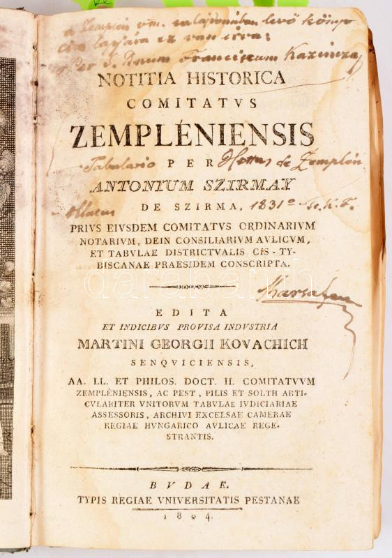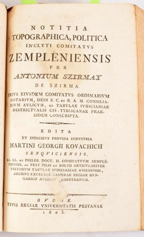 Szirmay, [Antal] Antonius: Notitia historica comitatus Zempleniensis. [...] Edita et indicibus provisa industria Martini Georgii Kovachich. Hozzákötve: Notitia topographica, politica inclyti comitatus Zempléniensis per Antonium Szirmay de Szirma. [...] Edita et indicibus provisa industria Martini Georgii Kovachich. Buda, 1804-1803, Typ. Regiae Universitatis Pestanae, 1 (címképmetszet)t+10+2+ 371;+ 485 [helyesen 486] p. + 4 sztl. lev. Latin nyelven.