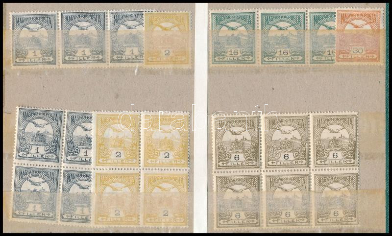 1913 45 db Turul bélyeg, közte 29 db II. típusú, összefüggések is, olajzöld / rózsa 60f sarokhibával (59.000)