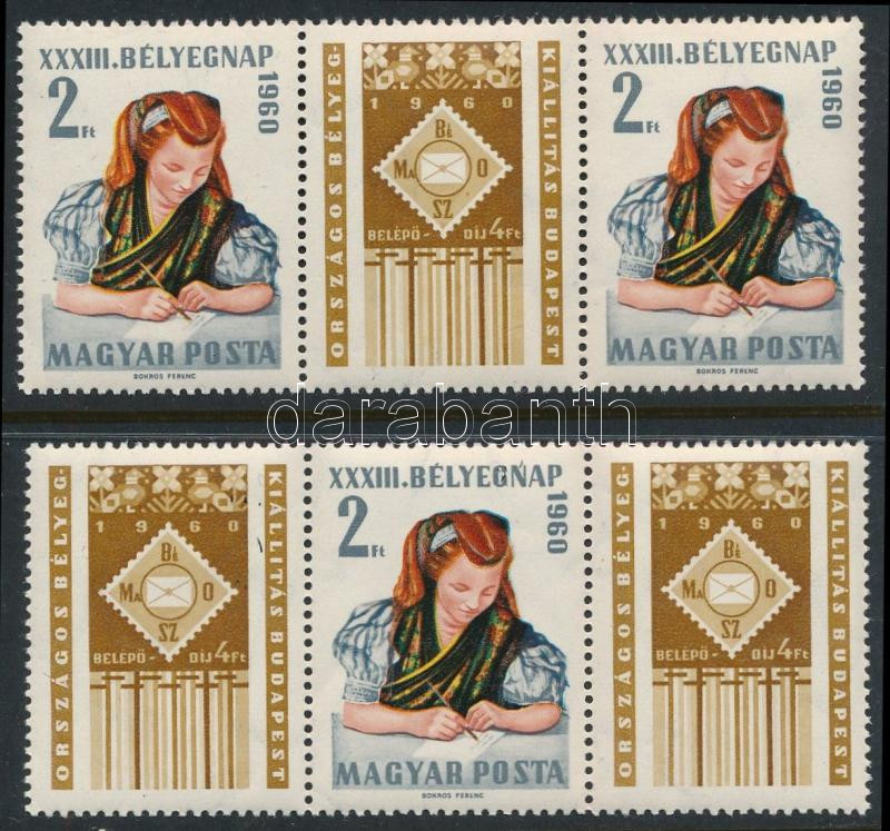 1960 Bélyegnap 2 klf hármascsík, mindkettőben fordított szelvényes pár