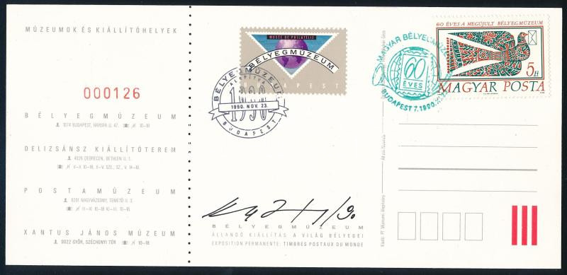 1990 Bélyegmúzeum belépő alkalmi bélyegzésekkel, a tervező Kass János aláírásával