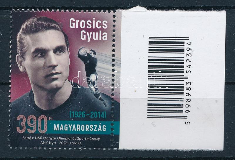 2026 100 éve született Grosics Gyula bélyeg ívszéli vonalkóddal