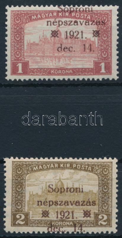 Nyugat-Magyarország VIII. 1921 Parlament 1K és 2K elcsúszott felülnyomással / Mi VI-VII with shifted overprint. Signed: Bodor
