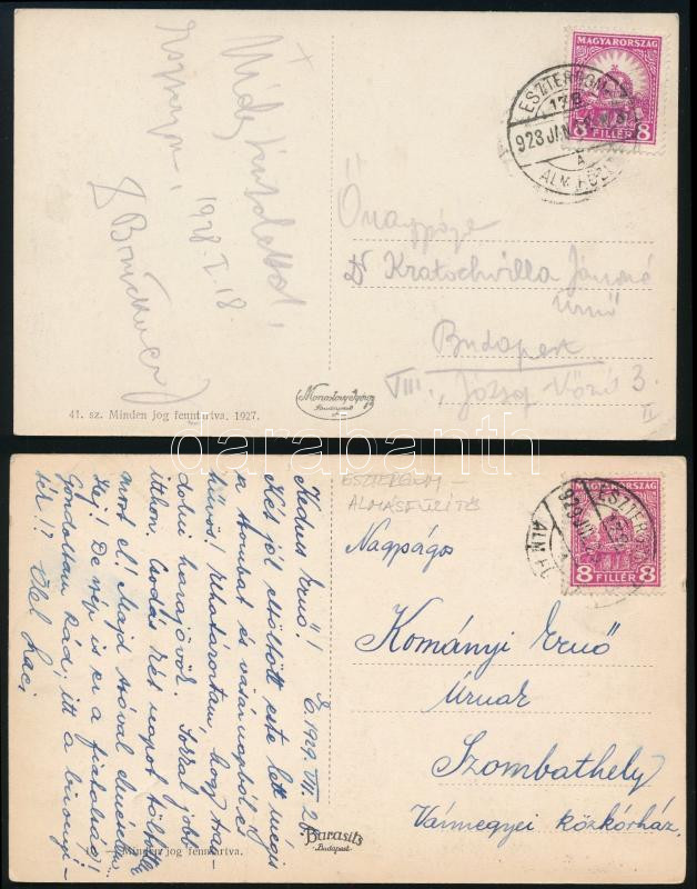 1928-1929 2 db képes levelezőlap "ESZTERGOM / ALMÁSFÜZITŐ / 178 A" mozgóposta bélyegzéssel