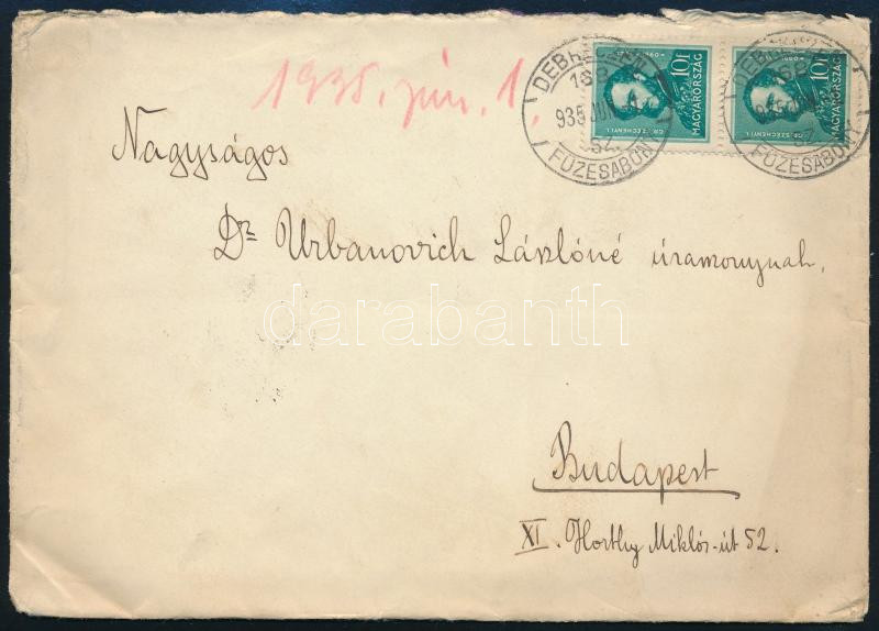 1935 Levél "DEBRECZEN-FÜZESABONY / 168 SZ." mozgóposta bélyegzéssel