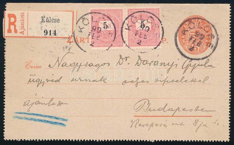 1899 Ajánlott díjkiegészített díjjegyes zárt levelezőlap "KÖLCSE"