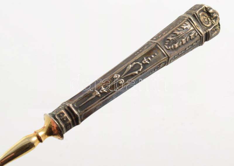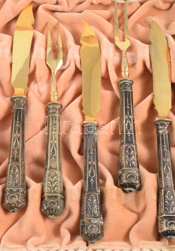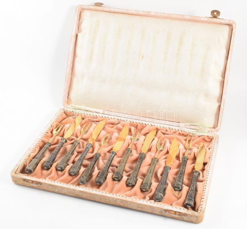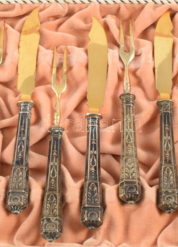 Ezüst (Ag) nyelű 6 személyes süteményes készlet. 1902-1937 közötti behozatali fémjel, díszdobozban, h: 14-15 cm