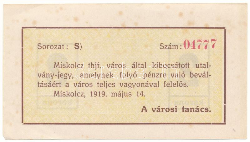 1919. Miskolc 05.14. 2K "Miskolcz város" utalvány-jegye "S 04777" sorszámmal T:VF hajtatlan, de sarokhajlások, fo.