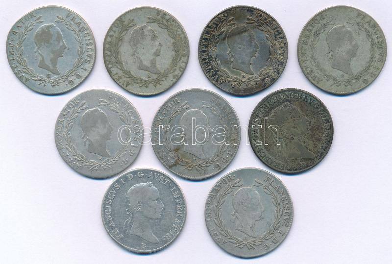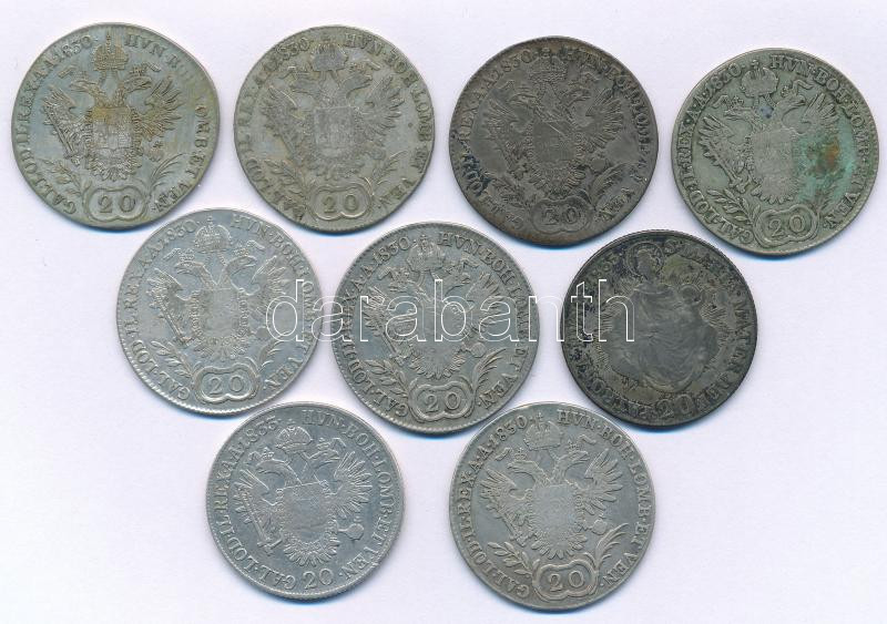 1830-1835. Kilenc darabos magyar és osztrák krajcár tétel, mindegyik 20kr névérték, 6xklf évjárat vagy verdejel, benne: 1830B (2x), 1830E (3x), 1830C, 1830A, 1833B, 1835B T:XF-VF