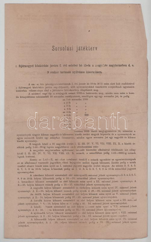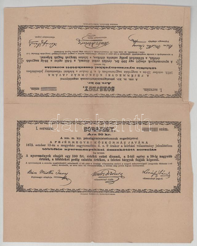 1873. Székesfehérvár 50K sorsjegy a Fejérmegyei Közkórház javára (2x) + Sorsolási játékterv T:VF-F