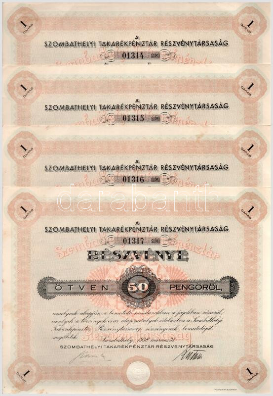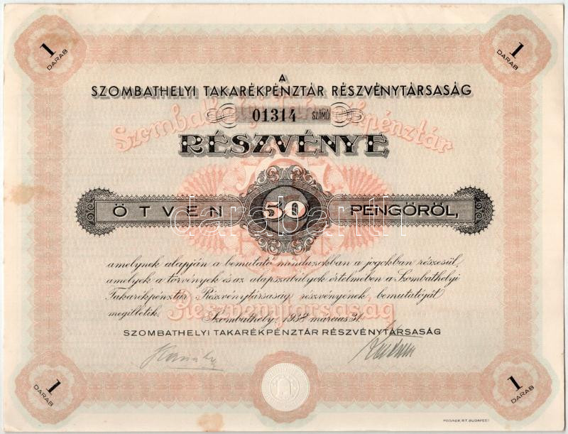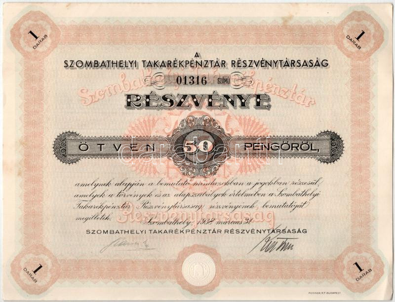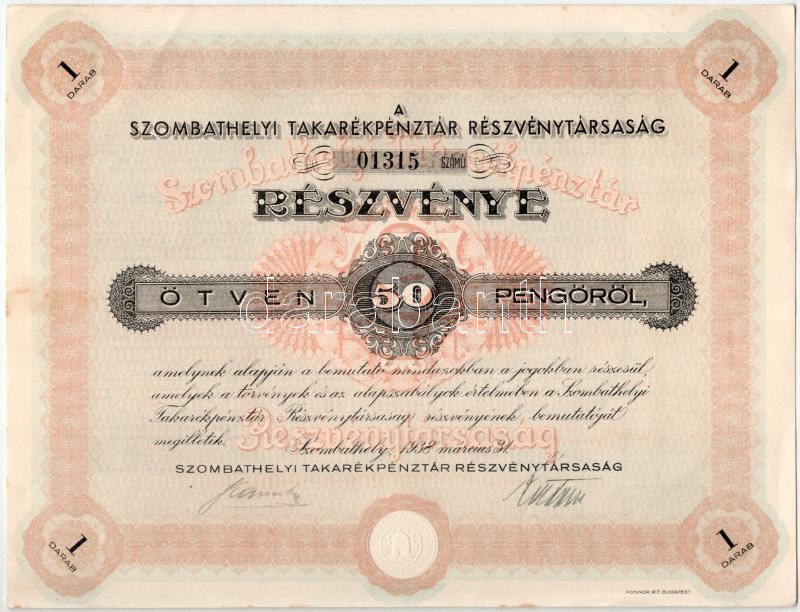 1938. Szombathely "Szombathelyi Takarékpénztár Részvénytársaság" részvénye 50P-ről, szelvényekkel, szárazpecséttel (4x) sorszámkövetők T:AU fo.