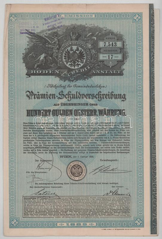 Austria / Wien 1889. "3% interest State Loan about 100 Gulden", with coupons + Wien 1908. "4% Tax-free State Loan Bond" C:F and F fine paper