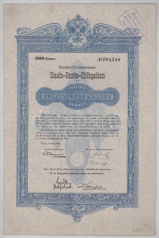 Ausztria / Bécs 1889. "3%-al kamatozó Államkötvény" 100G-ről, szelvényekkel + Bécs 1908. "4%-os adómentes Állami Kölcsönkötvény" 10.000K-ról T:F és F szép papír