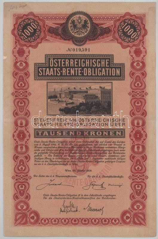 Austria / Vienna 1909. "Staats Rente Obligation" 1000 Corona without coupons C:F