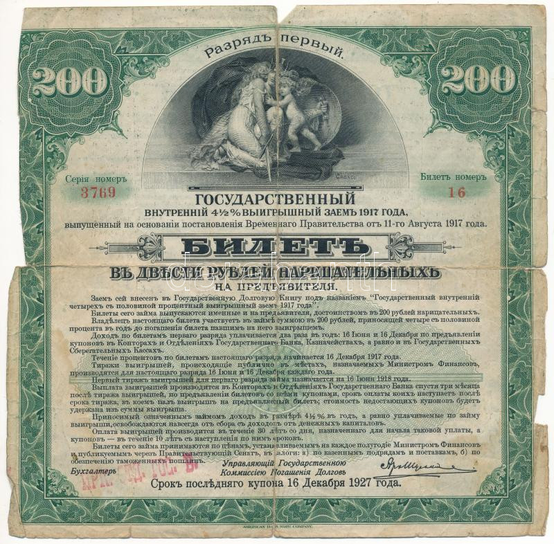 Orosz Polgárháború / Szibéria és Urál / Irkutszk 1919 (1917) 200R értékű "4 1/2%-os kötvény" zöld T:VG,G