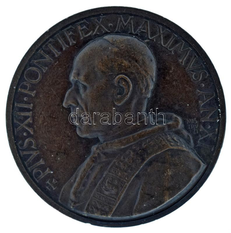 Vatikán 1956. "XII. Pius pápa" "PIVS XII PONTIFEX MAXIMVS AN XI / DEFENSIO FIDEI CATHOLICAE" kétoldalas bronz pápai emlékérem. Szign.: Mistruzzi (44mm) T:AU