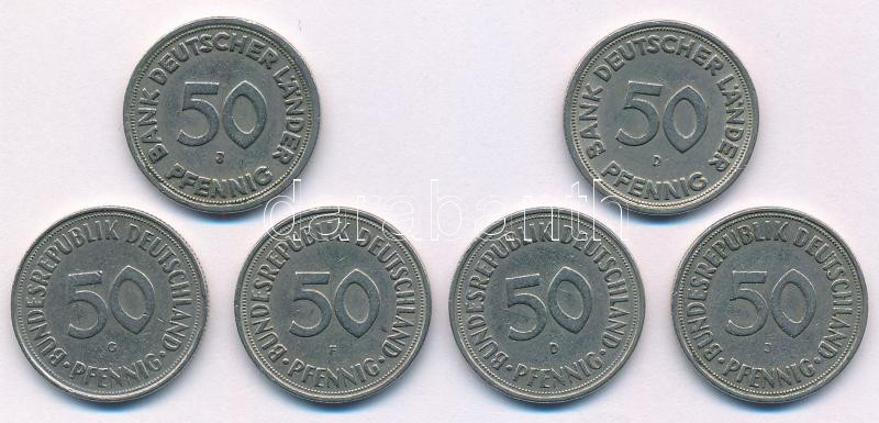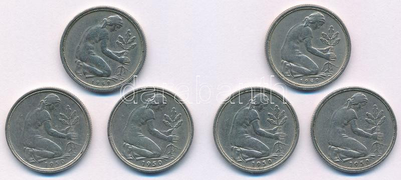 Német Szövetségi Köztársaság 1949. 50pf Cu-Ni (2xklf) "D" és "J" verdejel + 1950. 50pf Cu-Ni (4xklf) "D", "F", "G" és "J" verejelek T:XF,VF