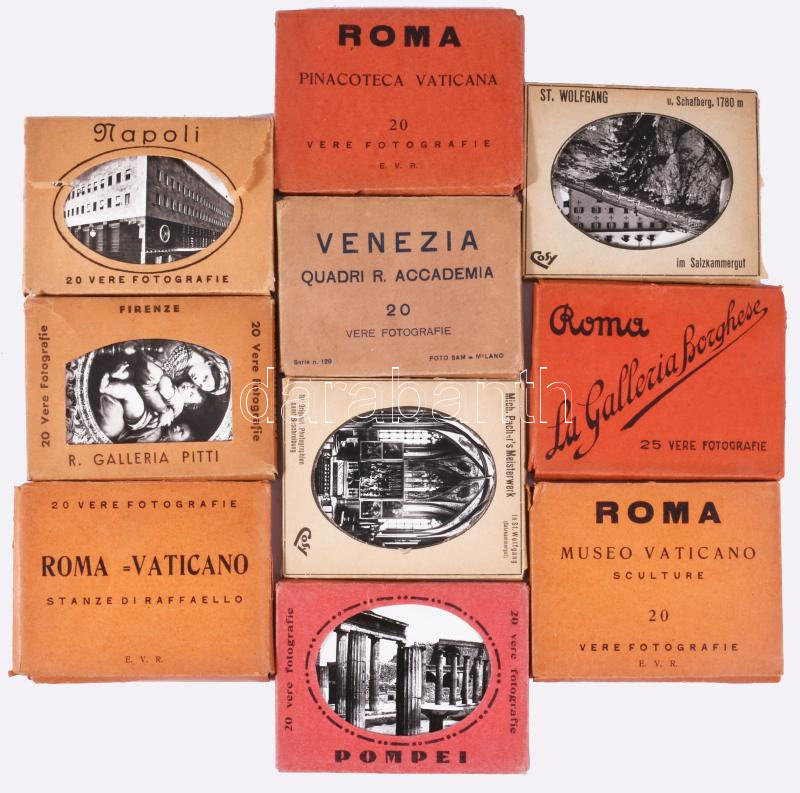 10 db különféle külföldi képsorozat: St. Wolfgang (Salzkammergut), Pompei, Napoli, stb. Részben sérült papírborítókkal, 7x9,5 cm körüli méretben.