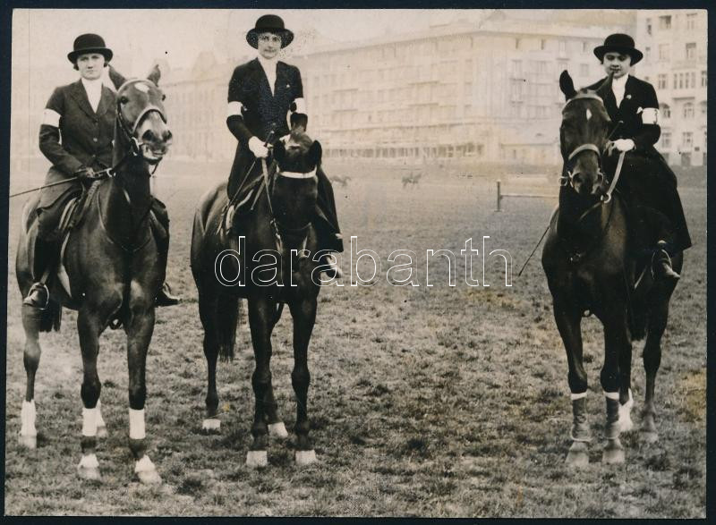 1931 Három úri hölgy a gróf Andrássy tereplovagláson a Vérmezőn, hátoldalon feliratozva, névlistával, publikált fotó, jó állapotban, 10×14 cm