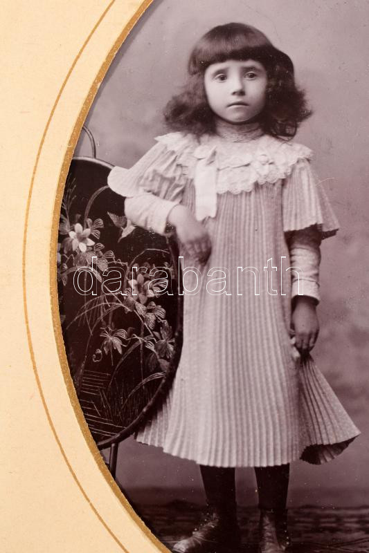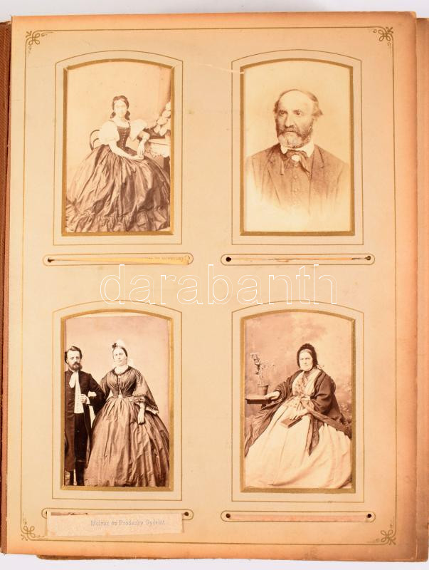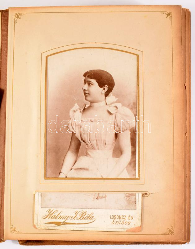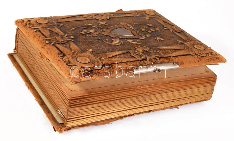 Régi dombornyomott, bőrkötéses fotóalbum kekményhátú fotókhoz, sérülésekkel, gerinc hiányzik, 62 db vegyes fotóval