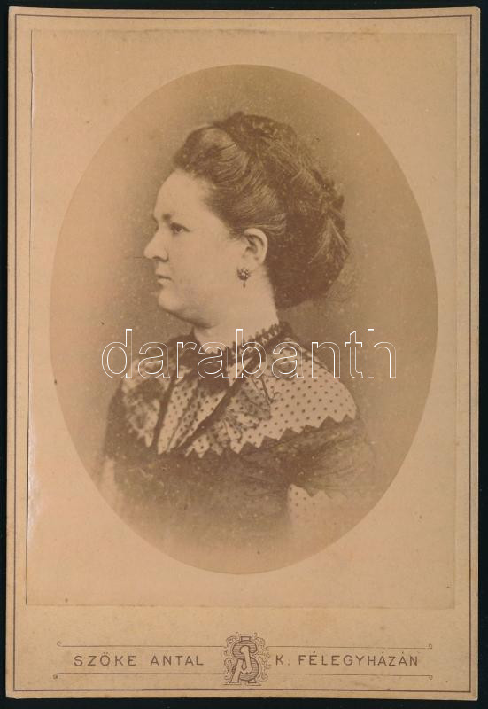 ca 1870 Női portré, keményhátú kabinetfotó Szőke Antal kiskunfélegyházai műterméből, 11x17 cm