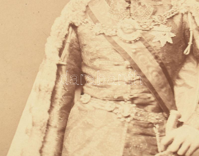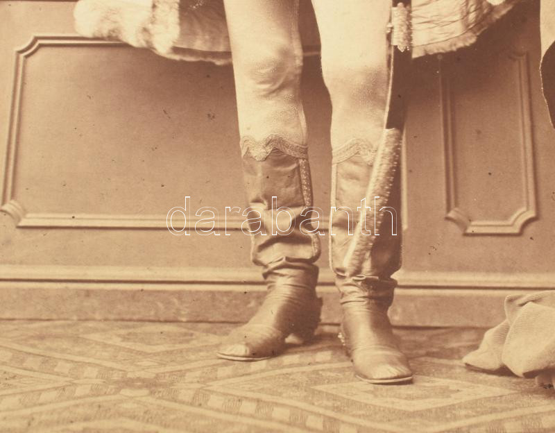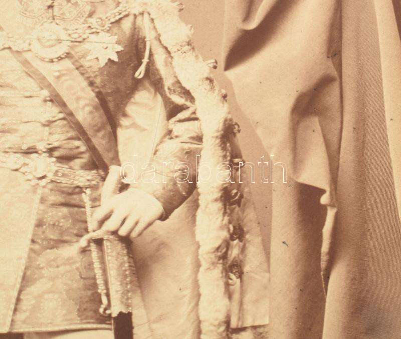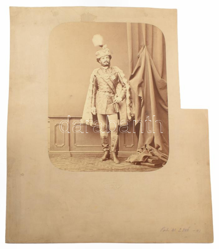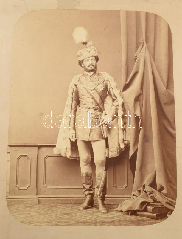 cca 1870 id. csíkszentkirályi és krasznahorkai gróf Andrássy Gyula (1823-1890) politikus, a Magyar Királyság 3. miniszterelnöke (1867-1871), az Osztrák-Magyar Monarchia közös külügyminisztere (1871-1879) díszmagyaros portréja. Nagyméretű, kartonra kasírozott fotó Borsos József pesti műterméből, hidegpecséttel jelzett, kissé foltos, a karton szélén kivágásból eredő hiánnyal, 29x22,5 cm, karton: 45x37 cm