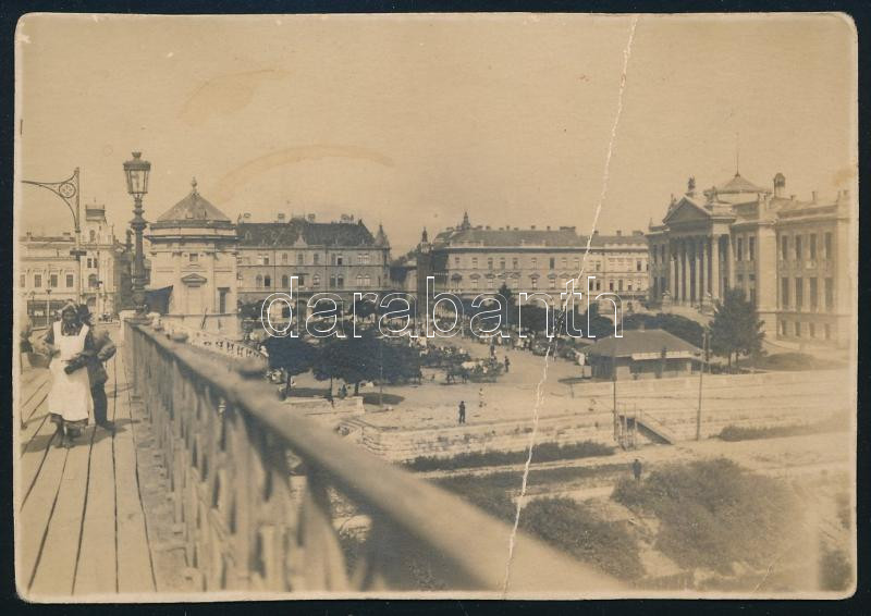 cca 1900-1910 Szeged, Móra Ferenc Múzeum, előtte piac, a Belvárosi hídról fényképezve, fotólap, törésnyommal, hátoldalán ragasztásnyomokkal, 8x11,5 cm