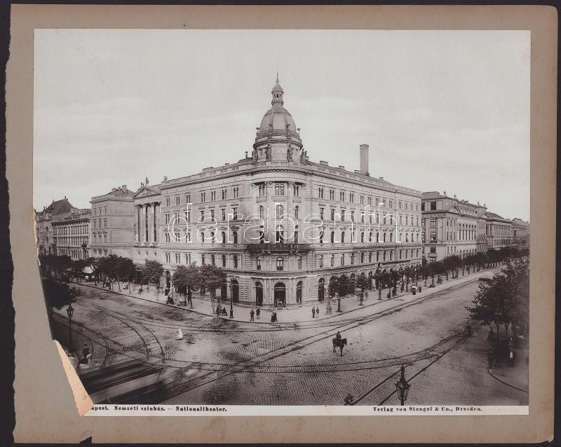cca 1900 Budapest VIII. Kerepesi út, Nemzeti színház és bérháza, villamosok, Szikszay Ferenc étterme, papírlapra ragasztott fotó, Stengel & Co., sérüléssel, 21×28 cm