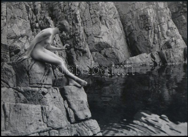 cca 1930 Meys, Marcel (1885-1972) francia fotográfus felvétele (Akt a parti sziklán), szolidan erotikus felvétel, 1 db modern nagyítás, jelzés nélkül, 15x21 cm