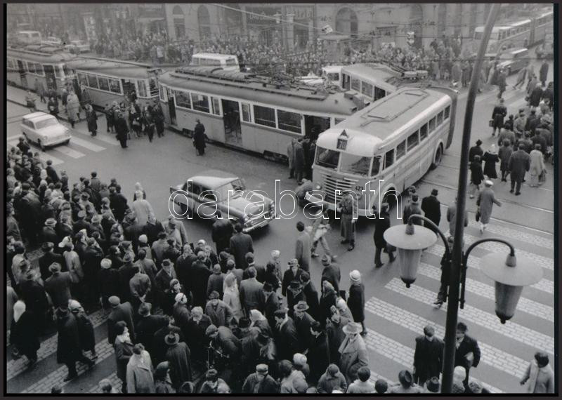 cca 1970 Budapest, villamos és troli találkája, 1 db modern nagyítás, jelzés nélkül, 15x21 cm