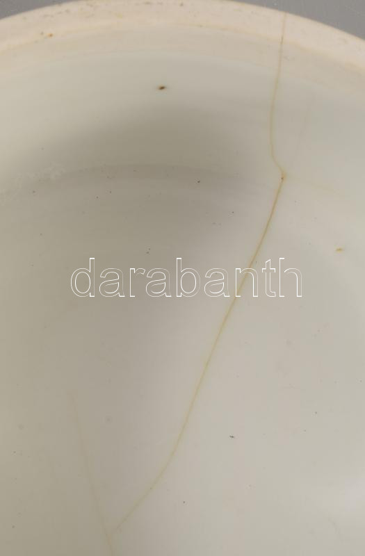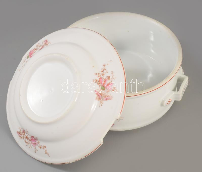 2 darab antik fedeles komatál / ételhordó tál, egyik darabon repedéssel, d: 19 cm